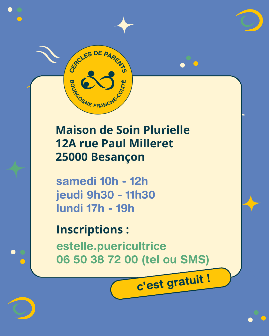 Seul.e ou en couple, avec ou sans votre enfant, venez échanger entre parents sur divers sujets autour de la parentalité et du jeune enfant : sommeil, gestion des émotions, allaitement maternel, diversification alimentaire, difficultés relationnelles et éducatives, activités d'éveil, ressentis parentaux, conciliation vie familiale et vie professionnelle...